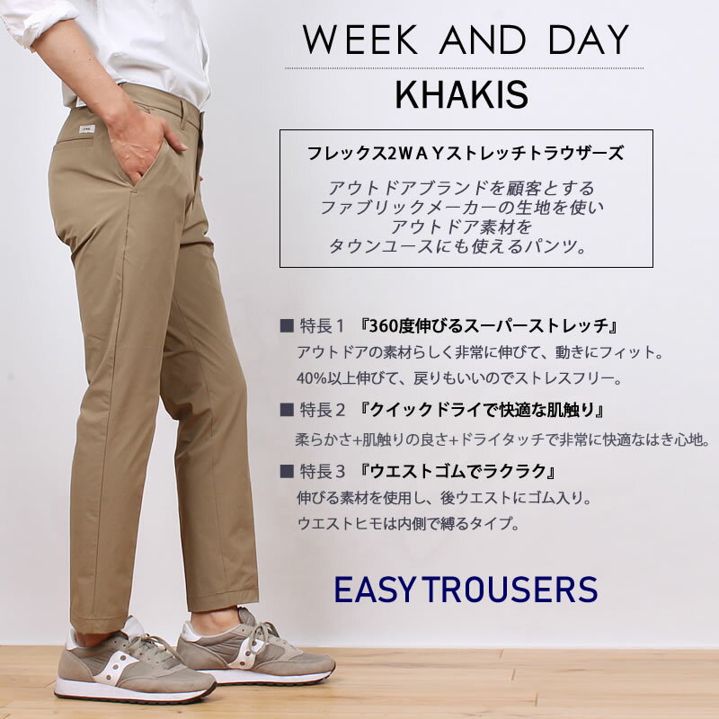 EDWIN WEEK AND DAY ラインナップ K4020 K40202L〜4L K2034 K4032 K2034 K2063 K2060オン/オフのボーダーを取り払った新たなスタンダード WEEK AND DAY 2WAYストレッチ イージートラウザー 【フレックス2WAYストレッチトラウザーズ】 アウトドアブランドを顧客とするファブリックメーカーの生地を使いアウトドア素材をタウンユースにも使えるパンツとして作ったアイテム。