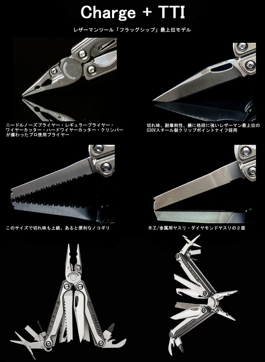 25年間、無償にて修理対応 made in USA サイズ:100mm(収納時)、重量:252g 仕様:・ニードルノーズプライヤー・レギュラープライヤー・154CM取替式ワイヤーカッター・154CM取替式ハードワイヤーカッター・クリンパ—・エレクトリカルクリンパ—・S30V直刃ナイフ・420HC波刃ナイフ・カッティングフック・ノコギリ・ハサミ・木工/金属用ヤスリ・ダイヤモンドコーティングヤスリ・ラージビットドライバー・スモールビットドライバー・マイナスドライバー (M)・定規 (19cm/8インチ)・栓抜き/缶切り・ワイヤーストリッパー ・18種ドライバービット・ランヤードリング・着脱式ポケットクリップ アウトドア 工具セット 防災 災害 救助 レスキュー キャンプ ナイフ ブッシュクラフト LEATHERMAN レザーマンジャパン マルチツール Charge+ TTi チャージ プラス 国内25年保証 防災セット 十徳ナイフ 登山 キャンプ ペンチ ノコギリ ナイフ ドライバーなどこれ一本で20種類入っているマルチツール。